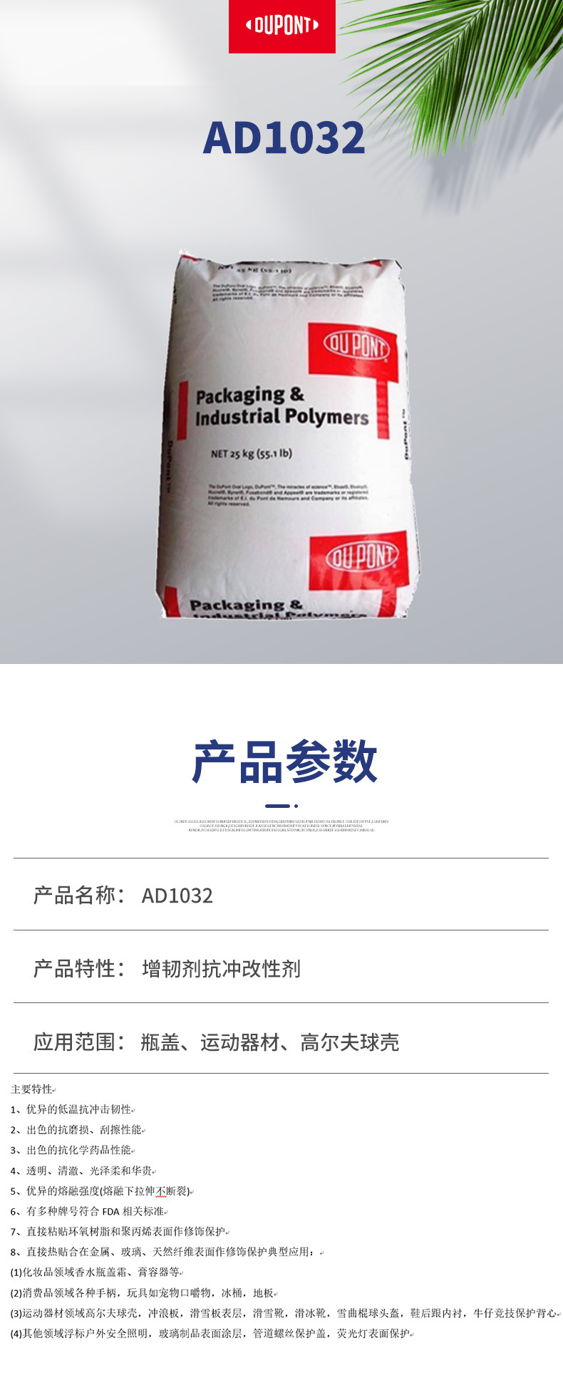 • 杜邦AD1032增韌劑 增韌劑抗沖改性劑 瓶蓋、運動器材、高爾夫球殼 物性表, 杜邦AD1032增韌劑 增韌劑抗沖改性劑 瓶蓋、運動器材、高爾夫球殼 產品參數,杜邦AD1032增韌劑 增韌劑抗沖改性劑 瓶蓋、運動器材、高爾夫球殼 性能表,杜邦AD1032增韌劑 增韌劑抗沖改性劑 瓶蓋、運動器材、高爾夫球殼 出廠報告, MSDS,, 物質安全資料表, UL黃卡,{ SGS報告, RoHS, 食品級認證, NSF飲用水標準, 產品資料, 產品性能, 出廠報告, 原廠原包, 代理商, 熱變形溫度, 熔指數, 流動系數, 抗沖擊性能、沖擊強度, 低溫韌性、低溫抗沖擊性能, 熔體流動系數、熔體流動速率, 加工工藝、加工參數、加工溫度, 歐盟RoHS 德國FDA 美國FDA 日本FDA